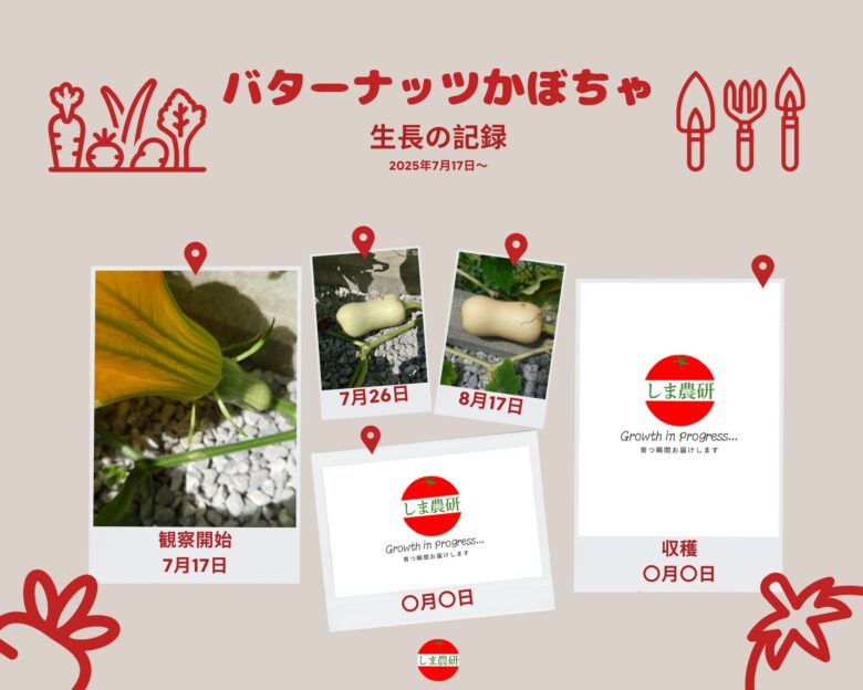 他の栽培者が自分の育てているきゅうりとバターナッツかぼちゃとゴーヤと比較し、栽培のヒントを得られるようにします。また、しま農研自身もこの記録を通じて、毎年の栽培の違いや学びを楽しんでいきます。
